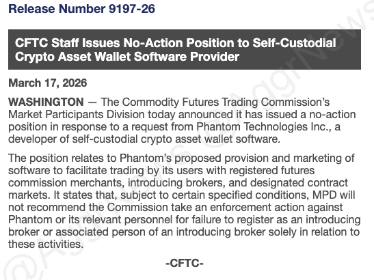 TechFlow đưa tin, ngày 17 tháng 3, Bộ Tham gia Thị trường (MPD) thuộc Ủy ban Giao dịch Hàng hóa Tương lai Hoa Kỳ (CFTC) thông báo đã ban hành thư “không hành động” đối với đơn xin của Công ty Phantom Technologies Inc., miễn trừ nghĩa vụ đăng ký làm nhà môi giới cho công ty này trong các điều kiện cụ thể.
