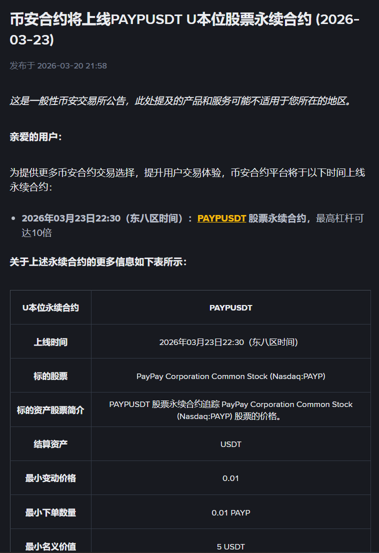 - 22:30 ngày 23 tháng 3 năm 2026 (giờ múi Đông 8): Hợp đồng vĩnh viễn cổ phiếu PAYPUSDT, đòn bẩy tối đa lên đến 10 lần