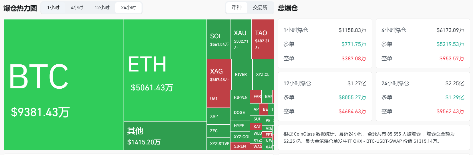 Giá trị vị thế BTC bị thanh lý đạt 93,8143 triệu USD, trong khi giá trị vị thế ETH bị thanh lý đạt 50,6143 triệu USD. Trong vòng 24 giờ qua, tổng cộng 85.557 người bị thanh lý vị thế, và vị thế bị thanh lý lớn nhất xảy ra trên cặp giao dịch BTC-USDT-SWAP của sàn OKX với giá trị lên tới 13,1514 triệu USD.