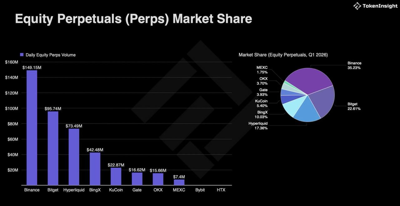 TechFlow đưa tin, ngày 20 tháng 4, theo báo cáo “Báo cáo sàn giao dịch tiền mã hóa quý I” do TokenInsight công bố, cục diện cạnh tranh trong thị trường hợp đồng vĩnh viễn trên cổ phiếu đang thay đổi nhanh chóng, đồng thời hiệu ứng đầu đàn ngày càng rõ rệt. Về khối lượng giao dịch cổ phiếu trung bình hàng ngày, Binance dẫn đầu với khối lượng giao dịch trung bình hàng ngày đạt 149,15 triệu USD, chiếm 35,23% thị phần; Bitget đứng thứ hai với khối lượng giao dịch trung bình hàng ngày đạt 95,74 triệu USD, chiếm 22,61% thị phần; Hyperliquid xếp thứ ba với khối lượng giao dịch trung bình hàng ngày đạt 73,49 triệu USD, chiếm 17,36% thị phần. Ba nền tảng này cộng lại chiếm khoảng 75% thị phần, đã hình thành nên nhóm dẫn đầu trong phân khúc này.