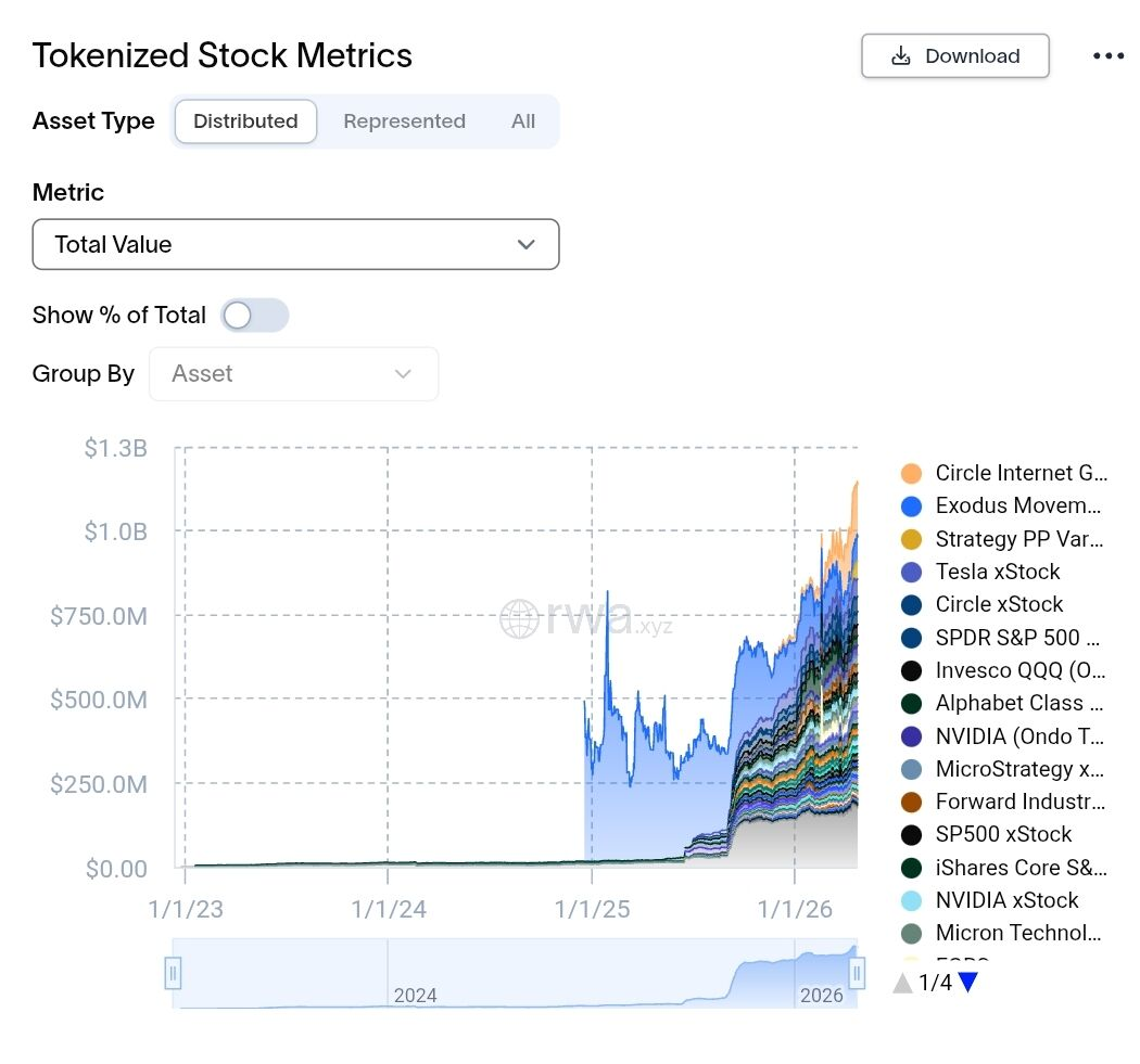 TechFlow đưa tin, ngày 26 tháng 4, theo dữ liệu mới nhất từ rwa.xyz, giá trị phân tán (Distributed Value) của cổ phiếu được mã hóa (Tokenized Stocks) đã tăng thêm 194 triệu USD (tăng khoảng 20,53%) trong 30 ngày qua.