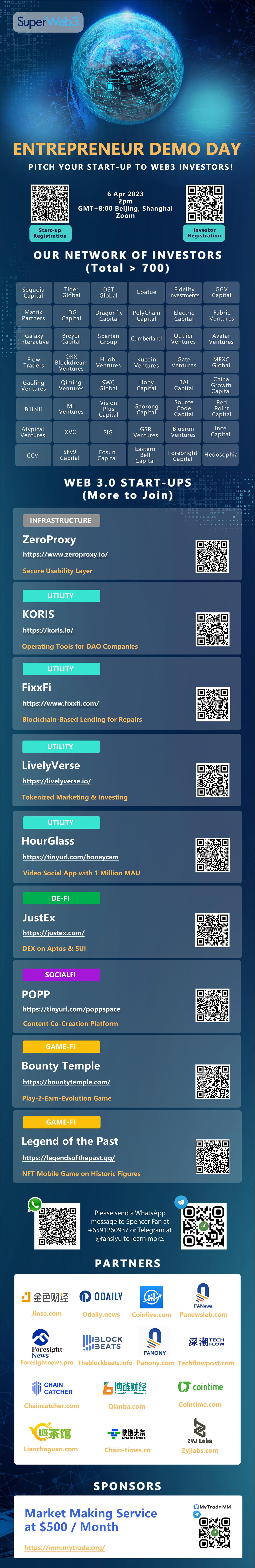 北京时间2023年4月6日,由SuperWeb3主办的第六届“Entrepreneur Demo Day”在ZOOM成功举行。本次活动采取ZOOM线上直播方式举办,吸引了来自多个不同国家的11家Web3.0领域的创业公司和107名Web3.0投资者报名。项目涵盖GameFi、Infrastructure、Metaverse、NFT, Utility等领域。所有参与活动的11家创业公司都展现了超出行业水平的专业性,向投资者简短的展示并介绍了自己的创新产品。