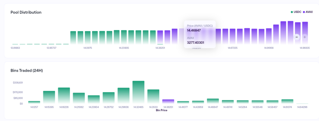 Trader Joe 上 AVAX-USDC 交易对的 Bin 分布情况和 Bin 交易量情况