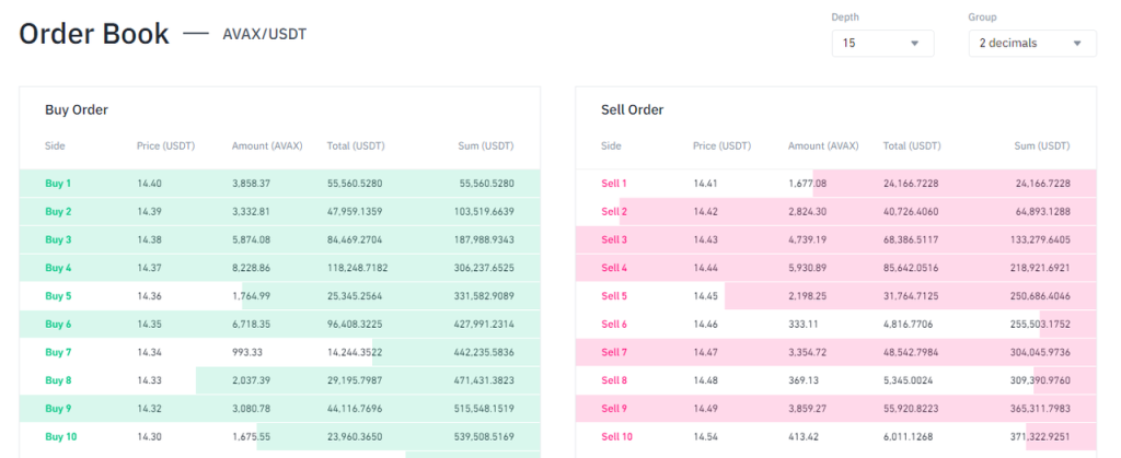Binance 的 Avax-USDT 交易对的订单簿情况