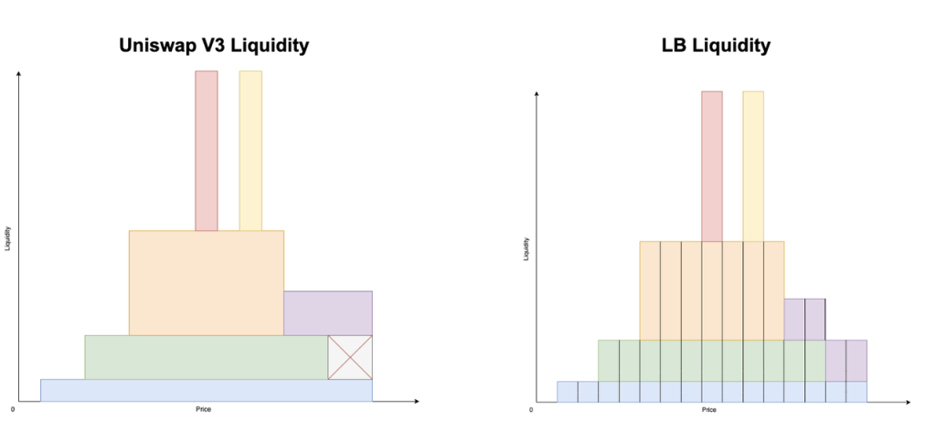 Uni V3 和 LB 流动性的结构比较,纵轴为流动性,横轴为价格,不同色块代表不同用户