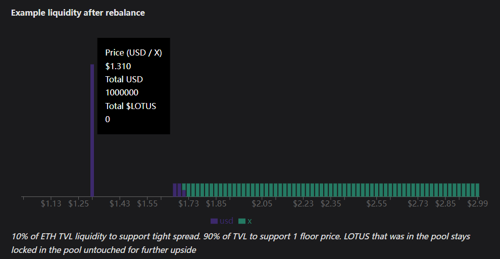 b. 把总 ETH 价值 /LOTUS 得出 LOUTS 的「保底价」,把剩余 90% 的 ETH 全部集中在保底价的 Bin 进行挂单,该底价可以在任何时间承接所有 LOTUS 流通代币的抛售。