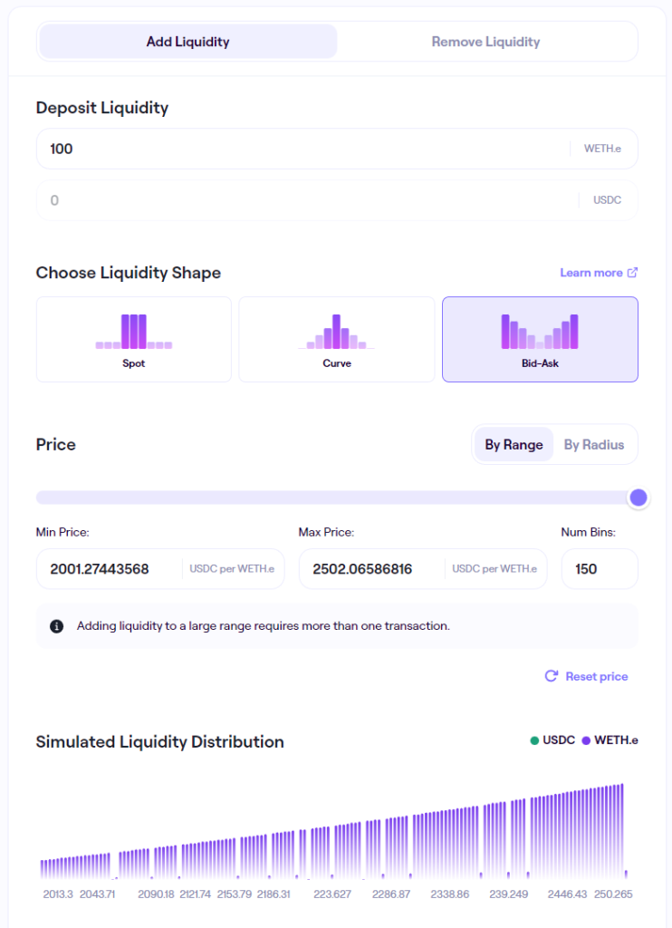 这个需求就通过 LB V2 很简单地实现,我们只需单边存入 100ETH,设定好卖出范围(2000-2500),并选择 Bid-Ask 模式(卖出挂单量随价格上升递增),即可便捷地实现这一需求。