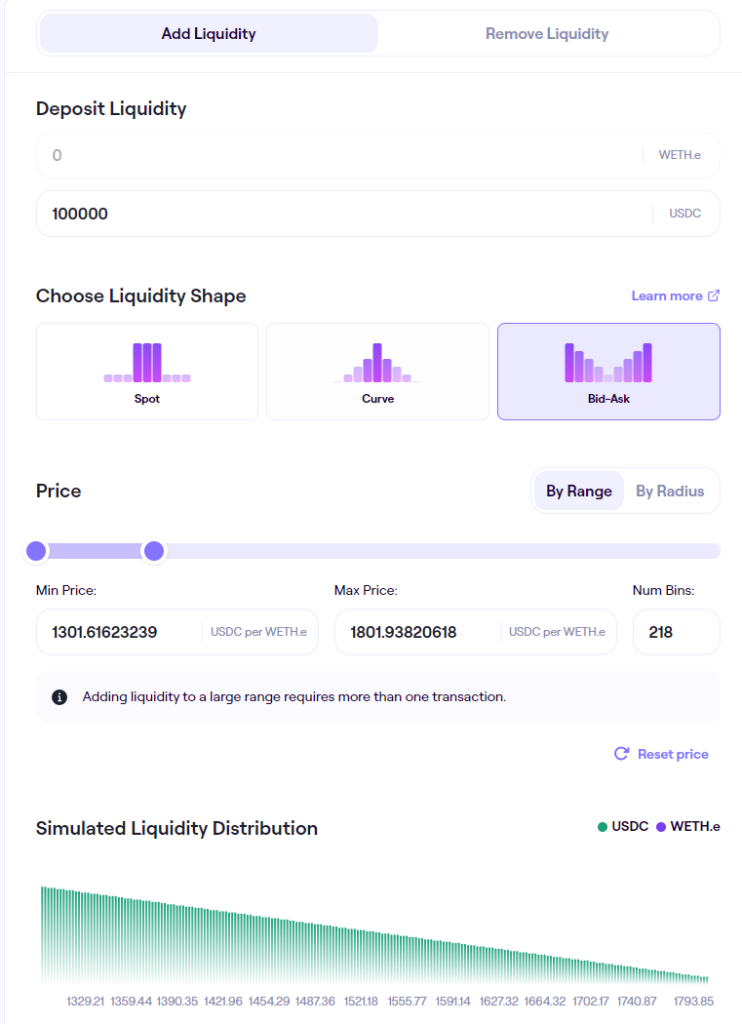 反之,想要在 1300-1800 美金的价格,随着价格下跌递增买入价值 10 万美金 ETH,并在 1300 左右完成全部购买,这是变种的平均成本法(DCA)建仓策略,我们只需单边存入 10 万美金 USDC,设定好买入范围(1300-1800),并选择 Bid-Ask 模式,当 ETH 跌到这个区间就能自动完成建仓,如下图: