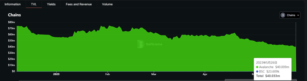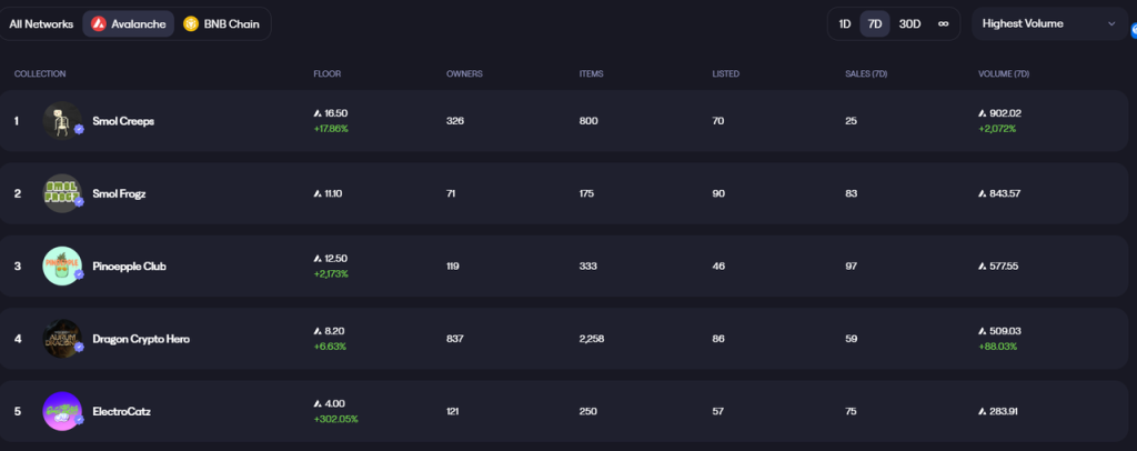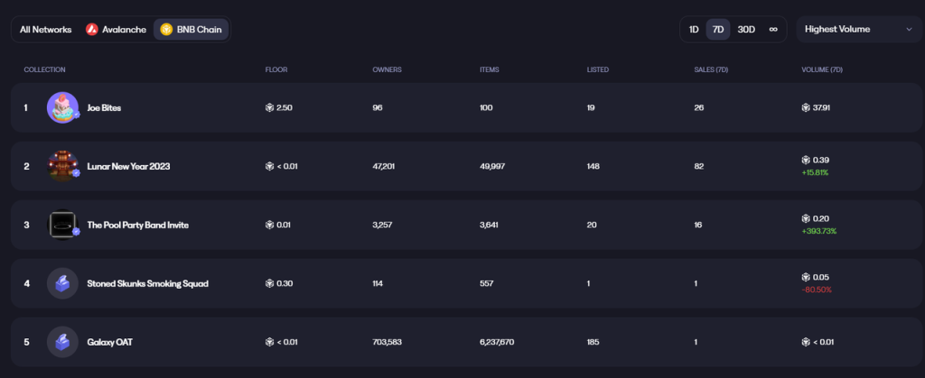 Joepegs 于 2022 年 4 月推出,目前支持 Avalanche 和 BNBchain 上的 NFT 交易,不过从交易量看来,两条链上的 NFT 交易量都不高。