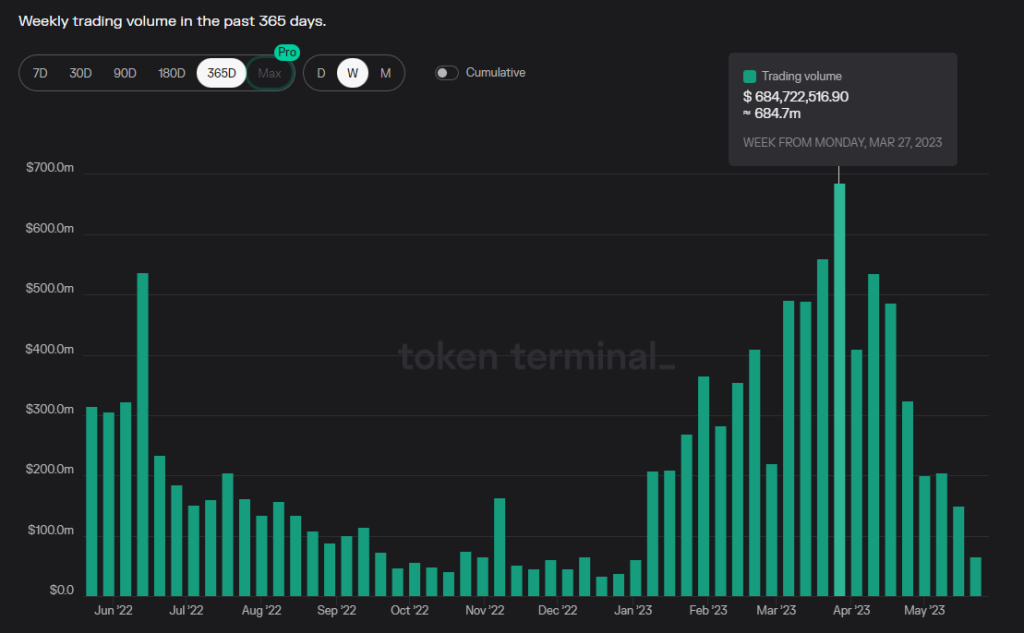 LB 便捷的做市体验在用户端也同样获得不错的反响。今年 3 月 ARB 代币进行空投后,其链上交易量保持高位, 早早登陆 Arbitrum 的 Uniswap V3 自然获得了最大的流动性和交易量,但 Trader Joe 彼时也凭借 LB 的产品体验 + 做市奖励运营活动在当时成为 ARB 第二大交易量产生的 Dex,一度占据 45% 的 ETH-ARB 交易量。