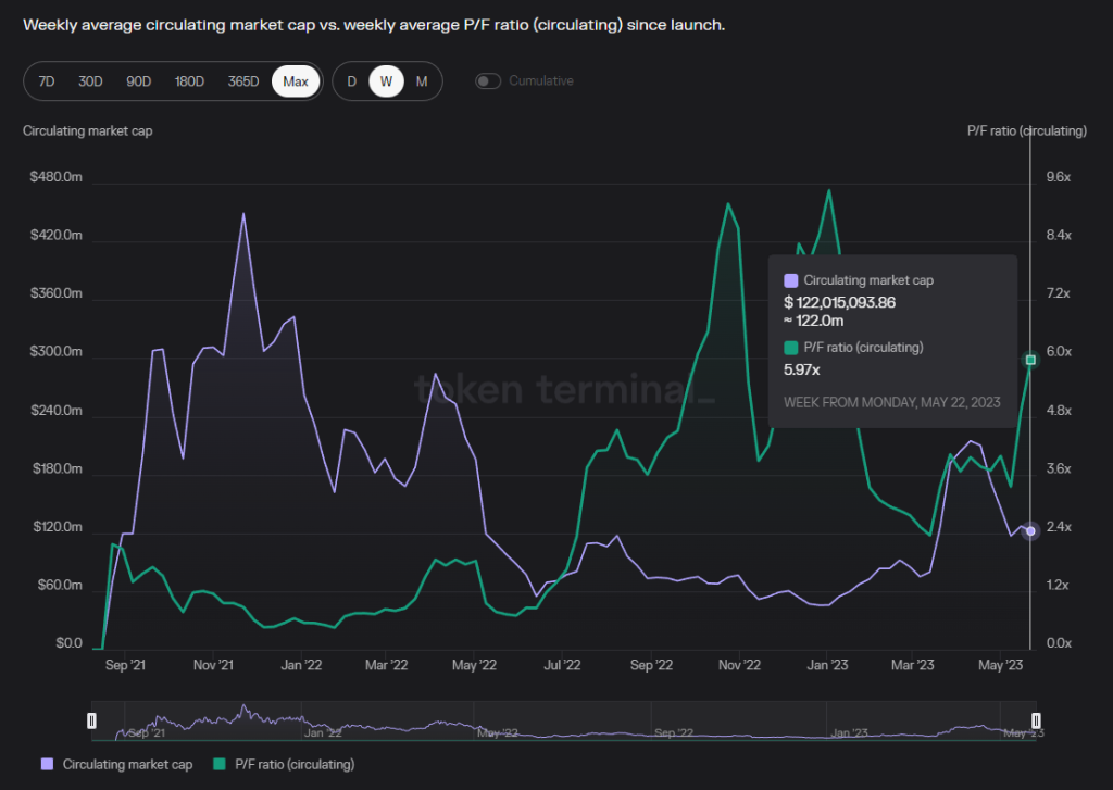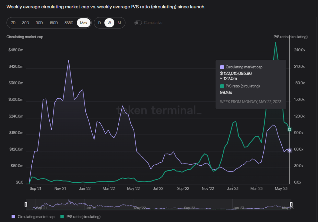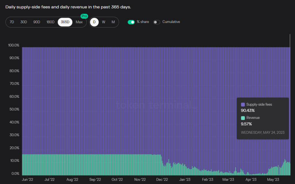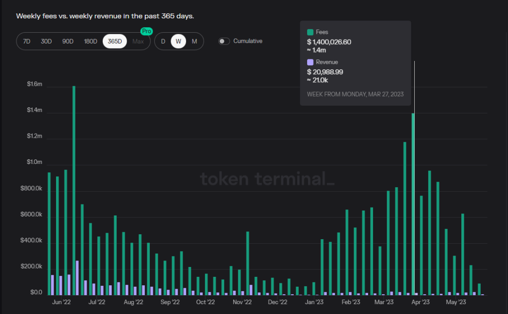 数据来源:供应市值 from Coingecko,费用、收入 from Tokenterminal,数据时间 2023.5.28