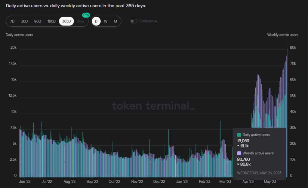 自从 V2.1 部署以来,Trader Joe 的活跃用户数明显上涨,已经创出协议诞生以来的新高,近期日活跃地址数 1.8 万,周活跃地址超过 8 万(Defillama 数据为 11 万),月活跃地址数近 20 万。而 C 端用户的持续增长,应该有 Trader Joe 不错的产品交互体验的一份功劳。