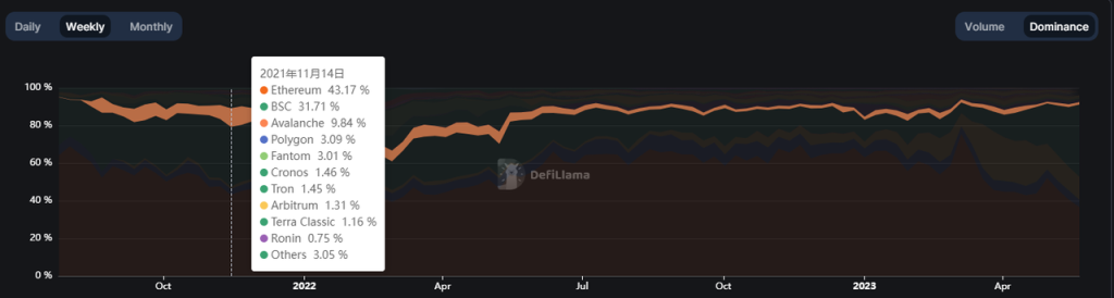 Avalanche 交易量市场份额占比,数据来源:https://defillama.com/dexs/chains