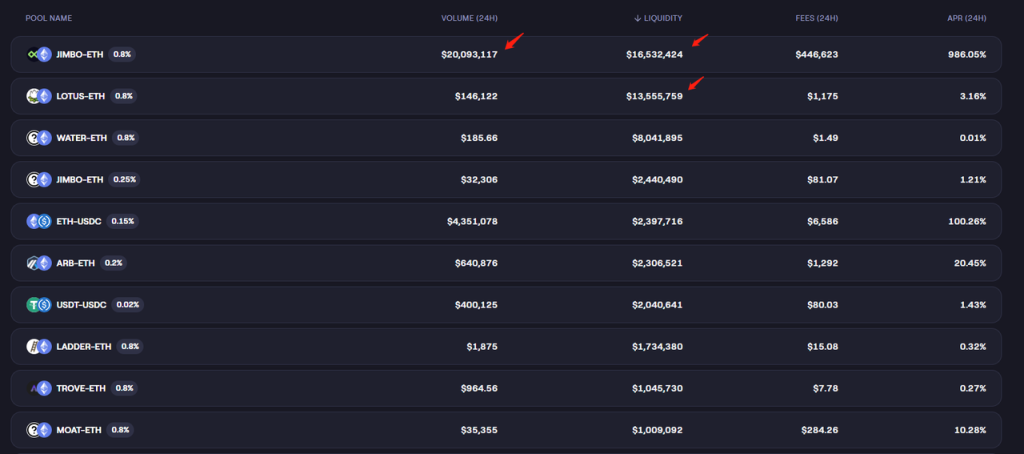 比如 JIMBO V2 的 LB Pool,项目上线后单日交易量达到 1800 万美金,第二天就快速降低到了 270 万美金。