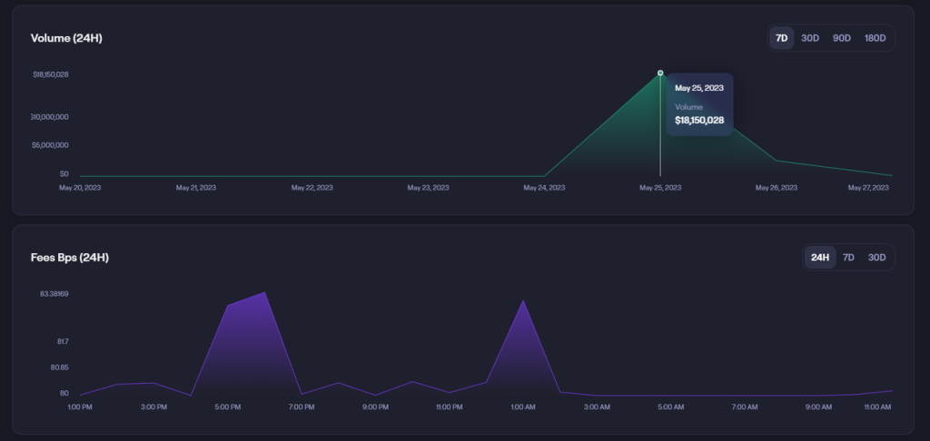 LOTUS 在前文已有过介绍,是一个基于 Trader Joe 进行代币发行和稳价的 Ponzi DeFi 项目,JIMBO 则是基于 LOTUS 的 Fork 改进版产品(有两个版本,下图中交易量排名第一的是 V2 版)。这两款产品一方面为 LB 带来了巨大的 TVL 增长(因为其募集的 ETH 和托底资金都留存在 LB),另一方面也因为代币上线早期巨大的价格波动创造很大的交易量和手续费收入。如下图所示,5 月 25 日 JIMBO 的 24 小时交易量达到了 2000 万美金,流动性达到了 1600 万美金,而 LOTUS 目前的流动性也仍然有 1300 万美金。