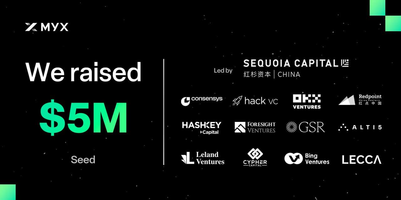 由D11 Labs孵化的MYX近期以5000万美元的估值完成了500万美元的种子轮融资,本轮融资由HongShan(Sequoia China)领投,其他投资方包括Consensys 、Hack VC、OKX Ventures、Redpoint China、HashKey Capital、Foresight Ventures、GSR Markets、Alti5、Leland Ventures、Cypher Capital、Bing Ventures、Lecca Ventures等。这些资金将被用于加速MYX的技术创新和市场拓展,推动其主网产品的快速上线和规模化发展。