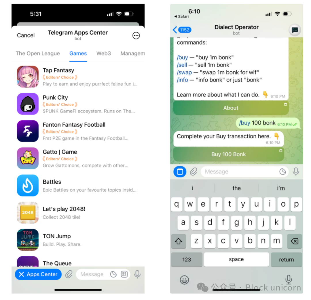 在加密领域,Telegram 是事实上的通讯应用,他们的机器人 API 创造了一个广阔的设计空间,可以嵌入发行和价值交换体验。像 Dialect Operator 和 Maestro 这样的产品就是这个观点的例证。它们表明用户希望能够在他们的聊天中直接进行交易。这些 Telegram 交易机器人符合发布者交易所的定义,因为它们将发现和意图与执行捆绑在一起,缩小了关注和价值传递之间的循环。Telegram 有自己的隐藏应用商店(转到搜索,然后输入「tapps」),有数百个机器人,允许用户发送付款、玩游戏、发现内容等。
