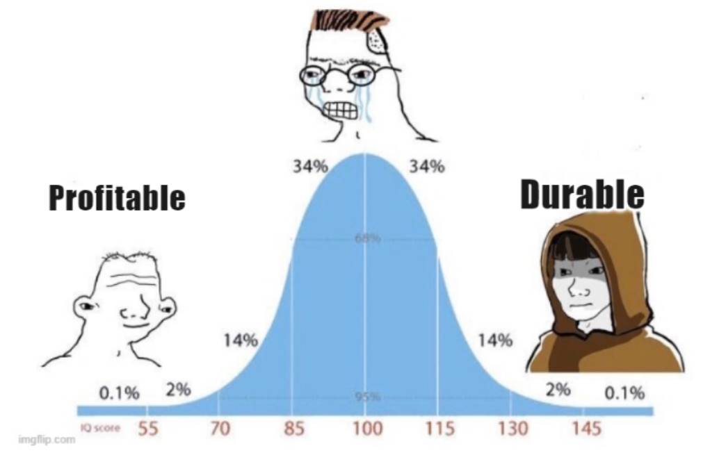 我们希望我们的投资组合能完全由耐久性项目组成,但这很难做到,错过一个盈利性交易在当时可能不是明智的选择。加密货币领域中盈利性交易的机会成本非常高。这就是为什么我们看到许多“VC 代币”经历繁荣与衰退。这也是为什么那些更早进入市场的人获利最多,而迟到者往往无所收获。