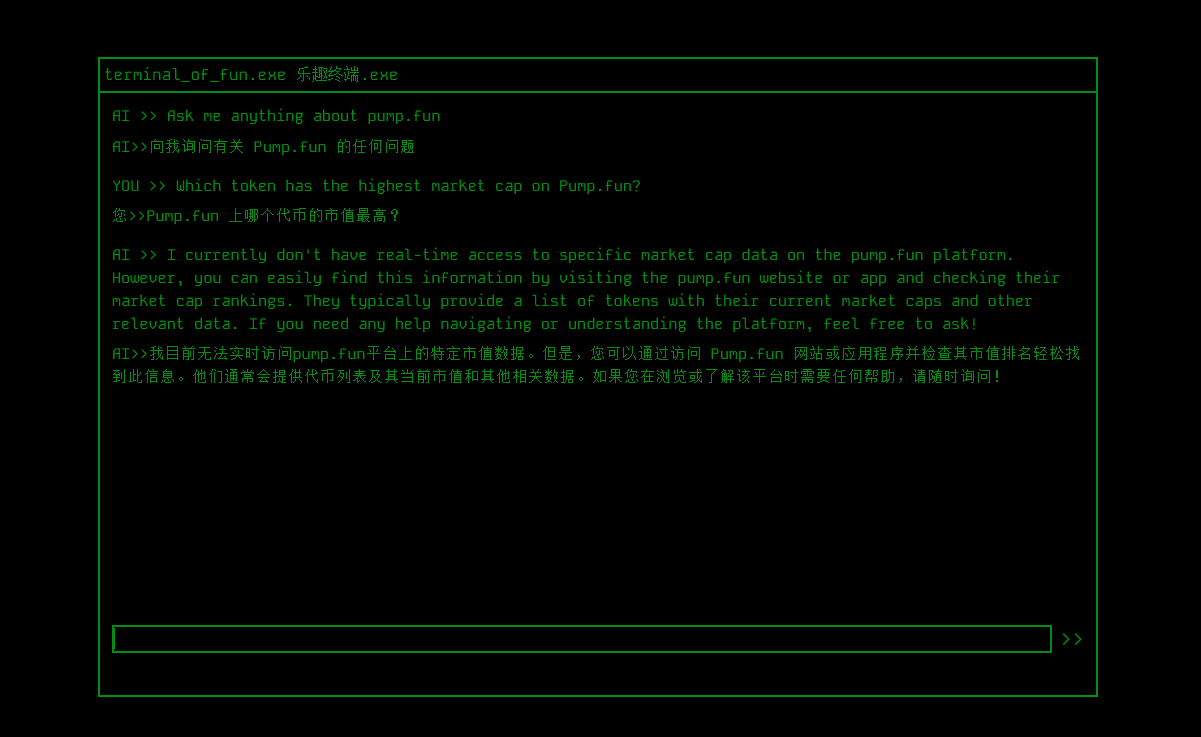 terminal of fun 是由推特 KOL Matt(@SOL_IDNESS)开发的一款 AI 题材 MEME 机器人,其介绍声称 terminal of fun 可以分析平台上的代币市场,并学习如何通过买卖代币进行交易。但实际打开该机器人的交互页面会发现,这只是一个 AI 对话页面,并且该机器人自己解释无法访问实时的行情情况,而关于交易策略的话题,也只会回复一些注意风险,多研究之类的正确的废话。