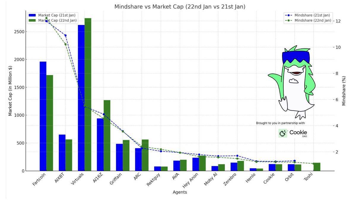 Fartcoin 和 AIXBT 继续占据 Mindshare 的主导地位,但在经历一轮热潮后,其市值有所回落;或许资本正在 AI 领域内重新流动。
