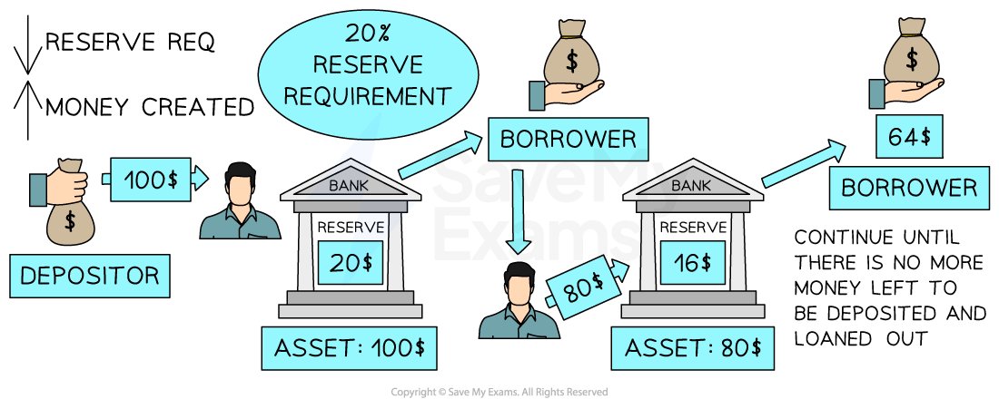 举例来说,如果银行必须将 10% 的存款作为准备金保留,则货币乘数 m 约为 10。这意味着系统中每注入 1 美元(如通过公开市场操作),最终在银行系统中可能形成高达 10 美元的新存款。