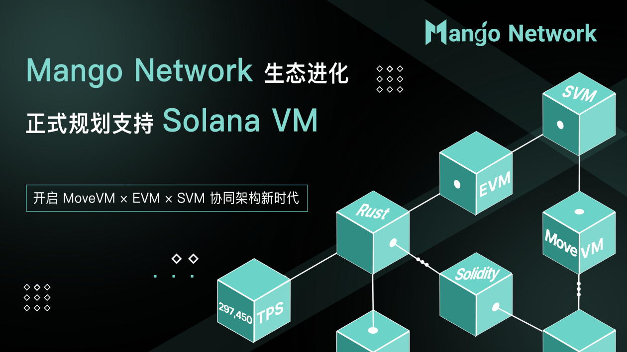 Mango Network 正在探索在其多虚拟机(Multi-VM)架构中增加对 Solana 虚拟机(Solana VM,SVM)的支持。该计划旨在进一步丰富 Mango 现有的 MoveVM 和 EVM 环境,通过引入 Solana 链特有的高性能执行环境,构建更加多样化、模块化且协同互补的虚拟机生态体系。