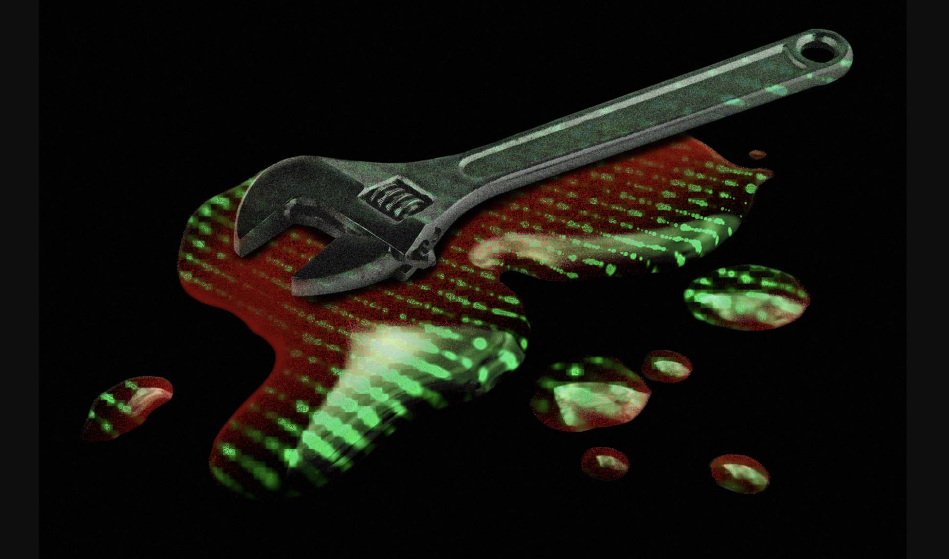 一把扳手躺在溢出的代码上,象征加密犯罪