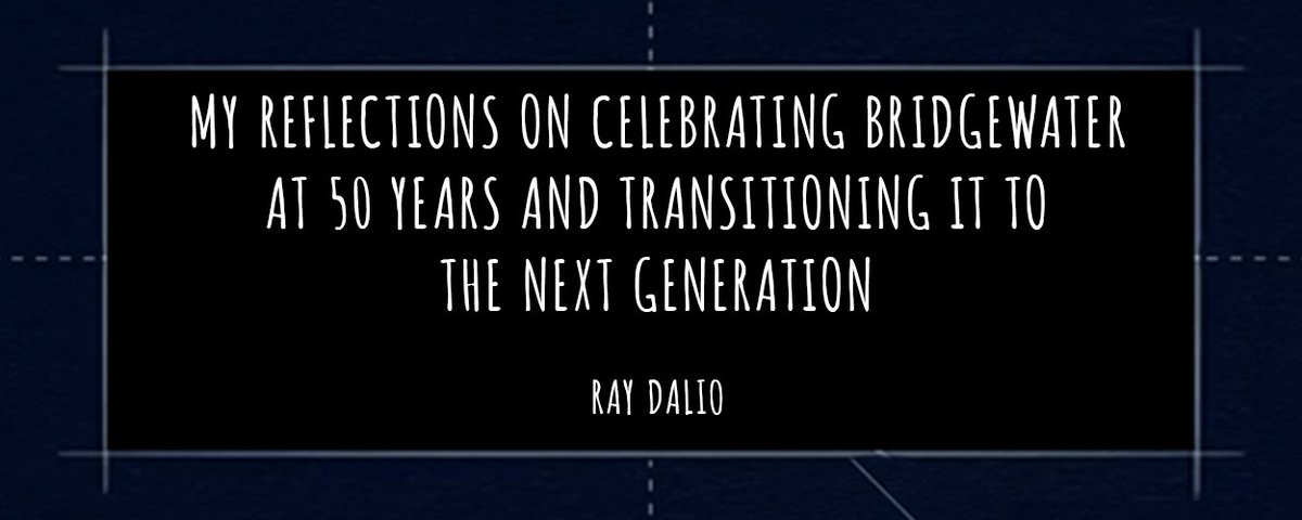 从我和一个打橄榄球的家伙在一间两居室的公寓里一起创建桥水开始,到把桥水打造成全球最大的对冲基金,拥有一支由大约1,500人组成的优秀团队,再到我们为客户赚的钱远超任何其他对冲基金——到现在,截至7月1日,又完成了最后一步,把桥水的接力棒交到下一代手中,我坚信他们完全有能力让公司继续辉煌蓬勃50年。多么美妙的旅程!多么让人愉悦!