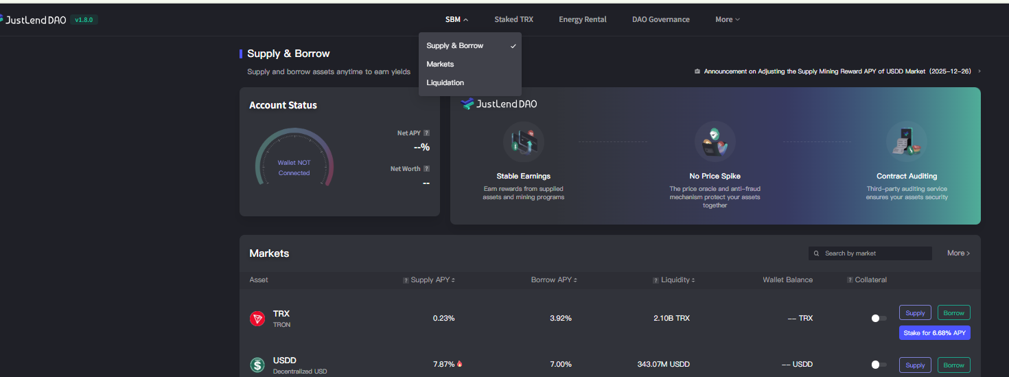 目前,JustLend DAO 已完成多个核心 DeFi 模块的深度整合,形成涵盖借贷市场(SBM)、流动性质押 sTRX(Staked TRX)、及能量租赁(Energy Rental)等功能的一体化产品矩阵,为用户提供全面、多元的链上金融服务。用户无需跨平台操作,即可在 JustLend DAO 一个平台完成 SBM 借贷、TRX 网络质押、能量租赁降低链上 Gas 成本等全场景金融需求,从而全面提升资金效率与交互体验。