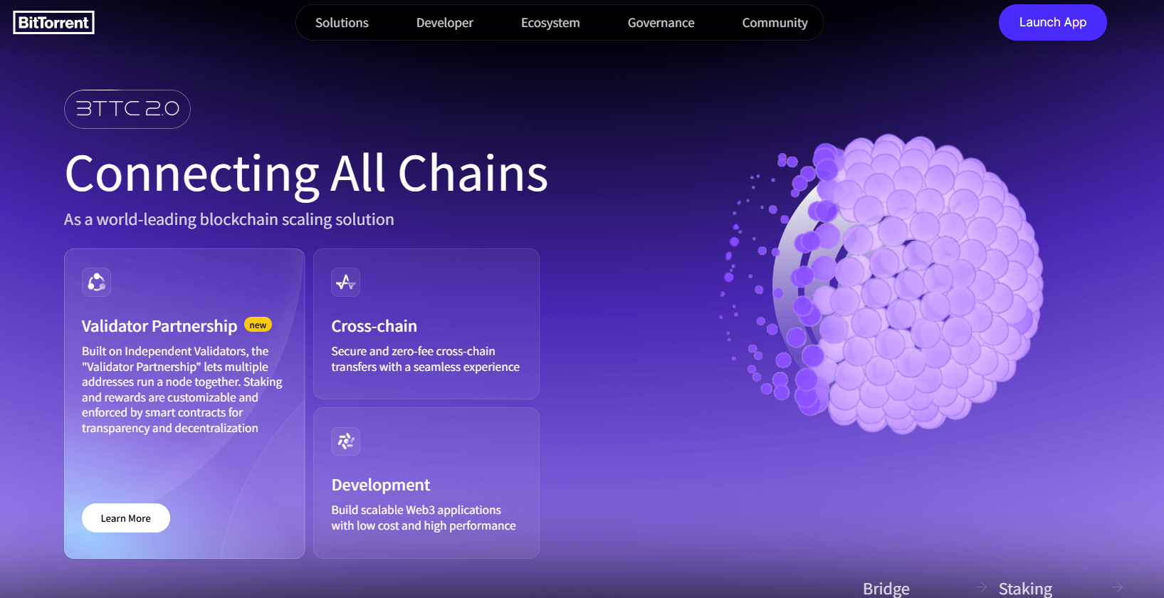 今年 6 月,BTTC 正式升级至 2.0 版本,通过模块化分层与标准化流程拆解设计,重构跨链技术底层架构。该版本将跨链流程“源链请求发起——信息传输——目标链执行”转化为通用的逻辑与标准化协议,对应搭建起:Root Contracts(根链层:跨链请求发起)——Delivery(中继层:信息传输)——BitTorrent Chain(执行层:DApp 应用运行平台层)三层架构,同并采用 PoS 共识机制。最终,BTTC 构建出一个安全、高效且具备扩展性的跨链网络,为实现多链间的资产流转与应用协同提供了坚实的技术基础。