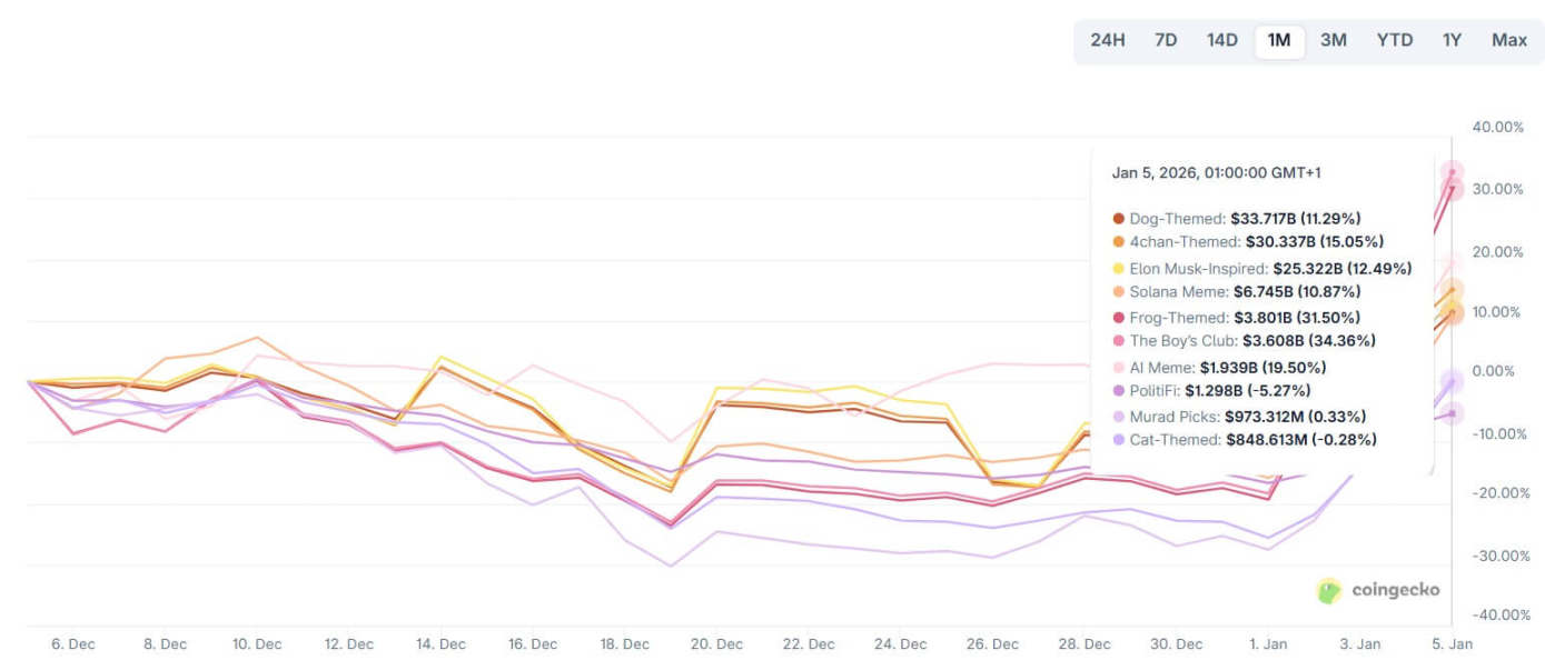 在经历了一整年的持续下跌后,一项衡量 Memecoin 在山寨币市场占比的核心指标「Memecoin 主导率」,从历史低点强势反弹。Memecoin 总市值重回 5000 亿美元关口,PEPE、BONK、FLOKI 等代币在开年之际纷纷录得两位数涨幅。