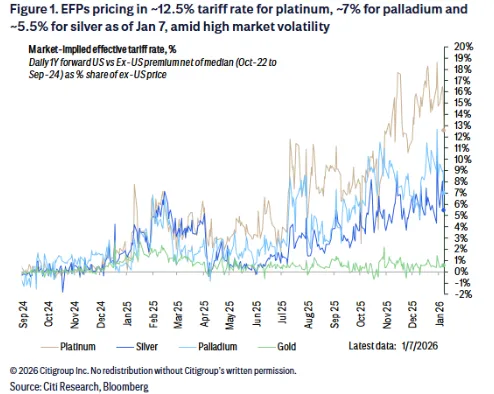 截至 1月 7 日,EFPs 定价显示市场预期铂金关税税率约为 12.5%,钯金约 7%,白银约 5.5%。这些隐含税率在高度波动中反映了市场的不确定性。