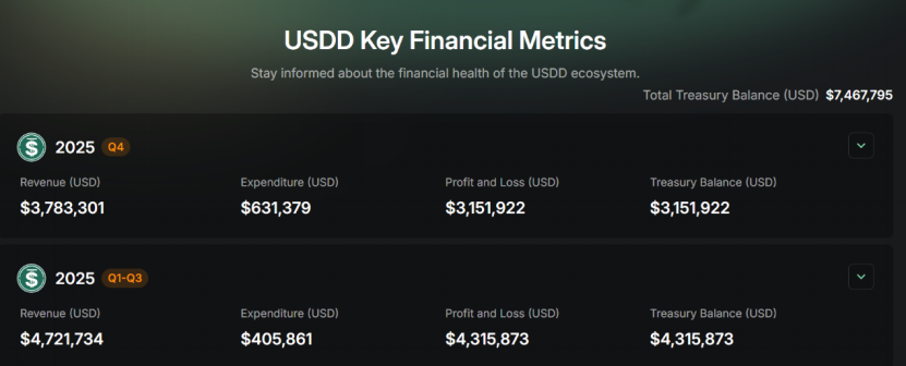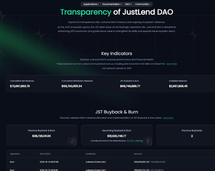 此外,在生态透明化建设层面,不但披露了储备金库资产明细,持续完善链上披露体系,让社区用户清晰掌握金库资金全貌;同时,JustLend DAO 与 USDD 官方平台均已正式上线“财务运营指标(Transparency)”专属披露页面,集中展示协议金库储备、JST 回购销毁资金池余额、已执行回购金额等核心数据及全量链上交易记录,实现核心运营数据的一站式可视化呈现,助力社区成员实时追踪协议收入累积、资金划拨与回购销毁的全流程执行动态。