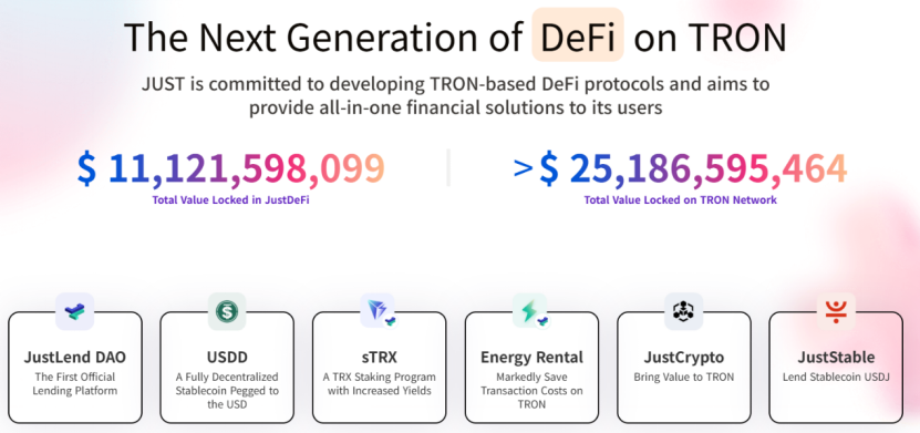 JST代币的价值根基在于其背后的JUST生态。作为波场TRON生态内的一站式DeFi解决方案,JUST已建立起一个完整且成熟的DeFi生态系统,囊括核心借贷协议JustLend DAO、去中心化稳定币USDD、质押产品sTRX、能量租赁Energy Rental及跨链产品JustCrypto等多元链上金融工具,能够一站式满足用户从资产增值到灵活配置的全场景需求。根据1月28日官方最新数据,波场TRON全网总锁仓价值(TVL)已达251亿美元,其中JUST生态TVL为111亿美元,占比44%,稳居波场TRON生态的核心地位。