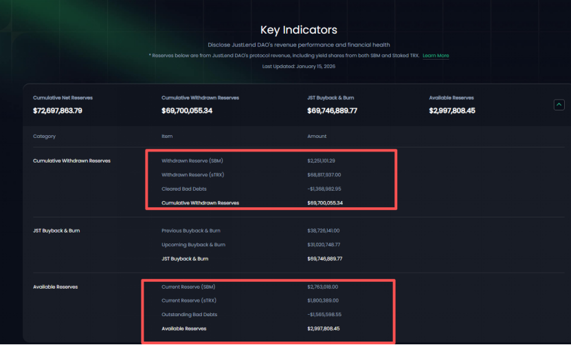 从收益数据来看,根据Transparency页面显示,JustLend DAO累计净收益已高达7269万美元。2025 年第四季度从协议中累计提取储备收益 6970 万美元,其中 sTRX 板块提取存量收益超 6881 万美元,SBM 板块提取 225 万美元;目前,JustLend DAO平台剩余的收益储备约299万美元,其中sTRX中可用储备180万美元。