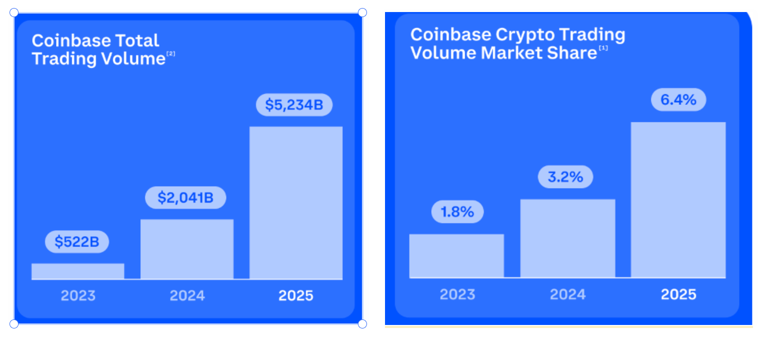 2025 年全年,Coinbase 平台总交易量达到 5.2 万亿美元,同比增长 156%。加密交易市场份额从 3.2% 翻到 6.4%。这两个数字都是公司上市以来最高。