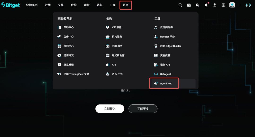 进入 Bitget 官方主页,点击更多 - 工具 -Agent Hub