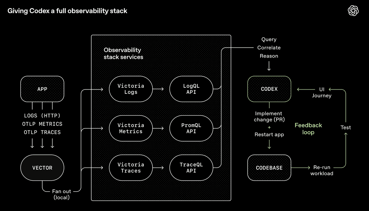OpenAI 的 Codex 工具链——一套完整的可观测性系统,让智能体可以查询、关联和推理自己的输出(来源:OpenAI)