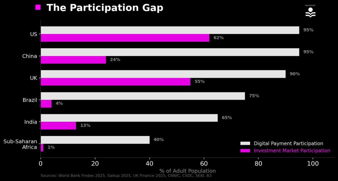 从参与率对比可见一斑:即便是投资渗透率最高的国家,也只有约一半人口以某种形式参与投资市场,而数字支付渗透率高达 95%。