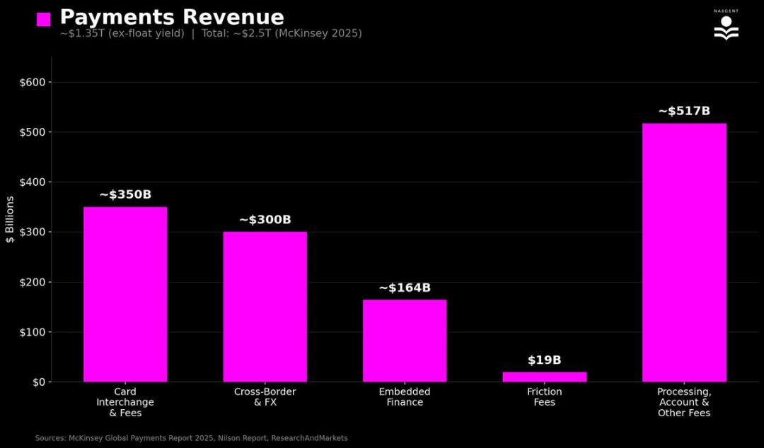 麦肯锡《2025 全球支付报告》显示,全球支付收入约 2.5 万亿美元。但其中近一半(约 1.15 万亿美元)是净利息收入:银行与支付账户在交易间隙靠沉淀资金赚取的收益。这更像是资金闲置收益,而非纯粹支付手续费。剔除这部分后,仅资金转移、交换费、处理费、嵌入式金融(Shopify、分期支付、Stripe)及摩擦性收费(ATM、透支、链上费用)带来的支付核心收入,仍有约 1.35 万亿美元。