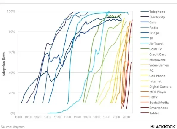 尽管存在这些障碍,数字资产基础设施的普及正沿着清晰的 S 曲线推进,如同信用卡与互联网历经数十年的普及过程。