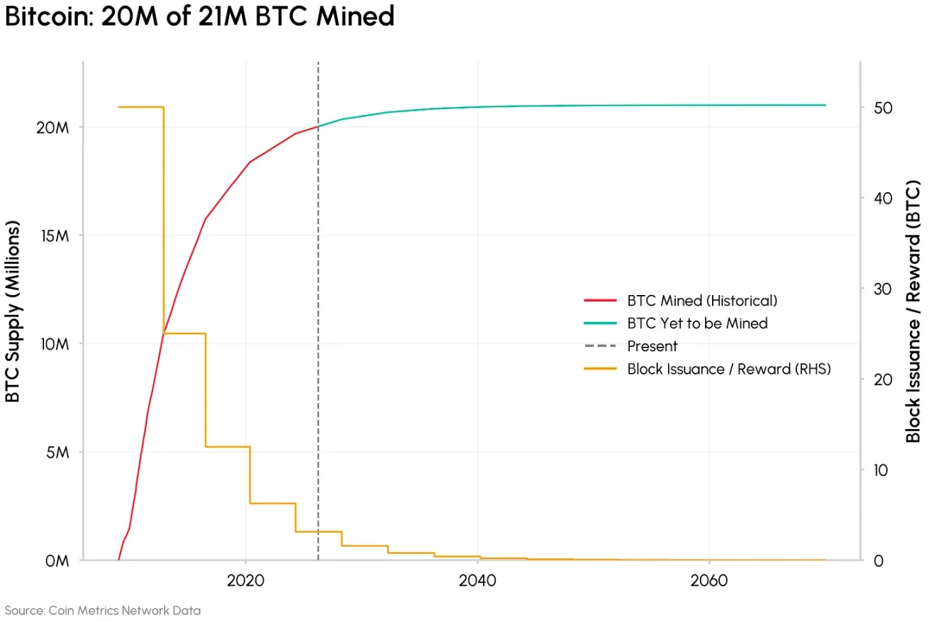 2026 年 3 月,第 2000 万枚比特币被挖出,这意味着剩余待发行的比特币仅剩 100 万枚。比特币总供应量已流通超 95%,在 2024 年 4 月减半后,区块奖励降至 3.125 BTC,发行速度按既定程序下降。