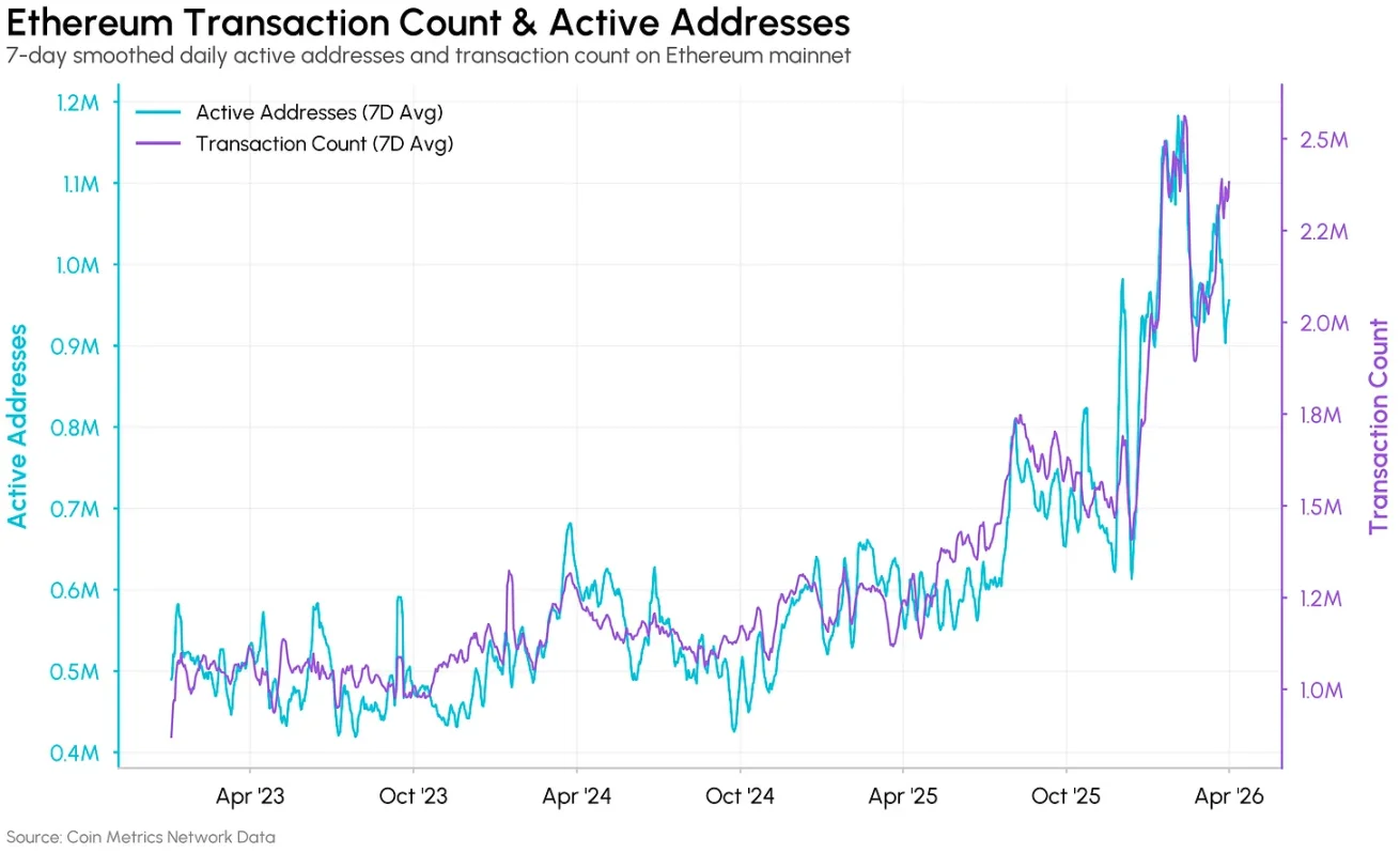 以太坊交易量和活跃地址数量,数据来源:Coin Metrics
