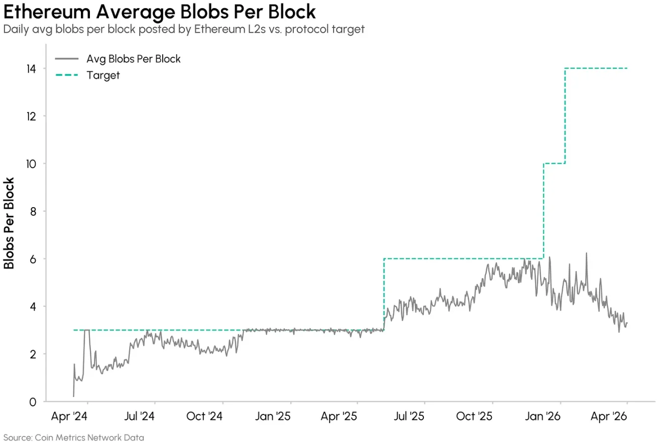 以太坊平均每个区块包含的 Blob 数量,数据来源:Coin Metrics
