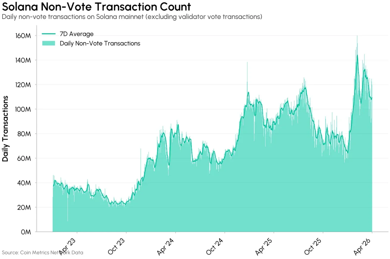 自 2024 年末以来,Solana 非投票类交易近乎翻倍,日均突破 1.2 亿笔。