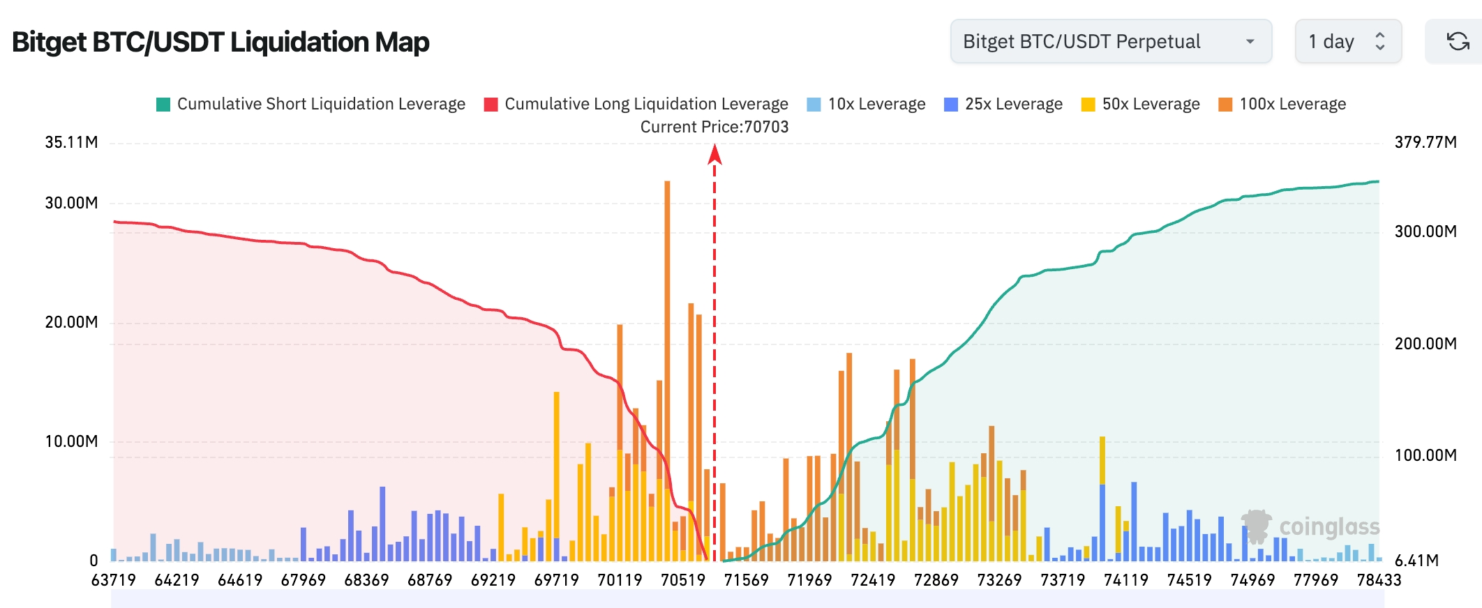 - Bitget BTC/USDT清算地图:当前价约70703附近正处于多空清算密集交界位,下方70000一线堆积大量多头爆仓区,跌破后容易触发快速踩踏下杀。上方72400–73300区间空头清算累计明显更厚,若价格上冲突破71500后,市场更可能先被拉向上方清算池形成逼空行情。