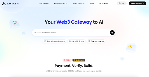 Bank of AI 为用户提供的全矩阵大模型服务与原生加密支付,成功打造了触达 Web 4.0 的“基础入门体验”。而在更深远的基建层面,其真正的雄心在于为 AI Agent 打造一张完整的链上金融网络。紧扣“Payment·Verify·Build”(支付、验证、构建)的核心战略脉络,Bank of AI 向行业全景呈现了一套专为 AI Agent 打造的底层运转体系。