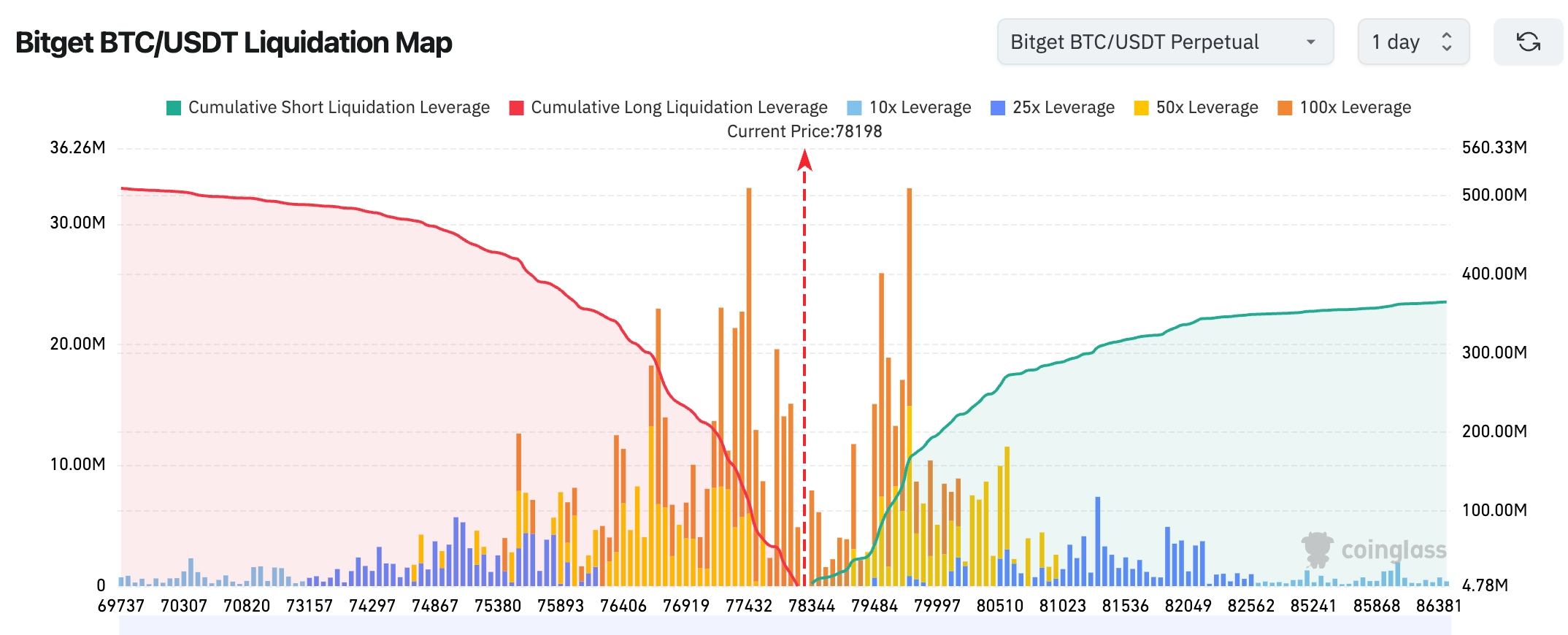 - Bitget BTC/USDT清算地图:当前价格约 78,200,处在多头清算密集区边缘,短期容易出现上下扫单的剧烈波动。上方空头清算累计规模更大且持续抬升,一旦突破该区间,触发空头挤压的概率较高,价格偏向继续上行。。