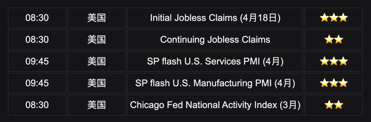- 美国至4月18日当周初请失业金人数公布:关注劳动力市场数据对联储政策预期的指引。