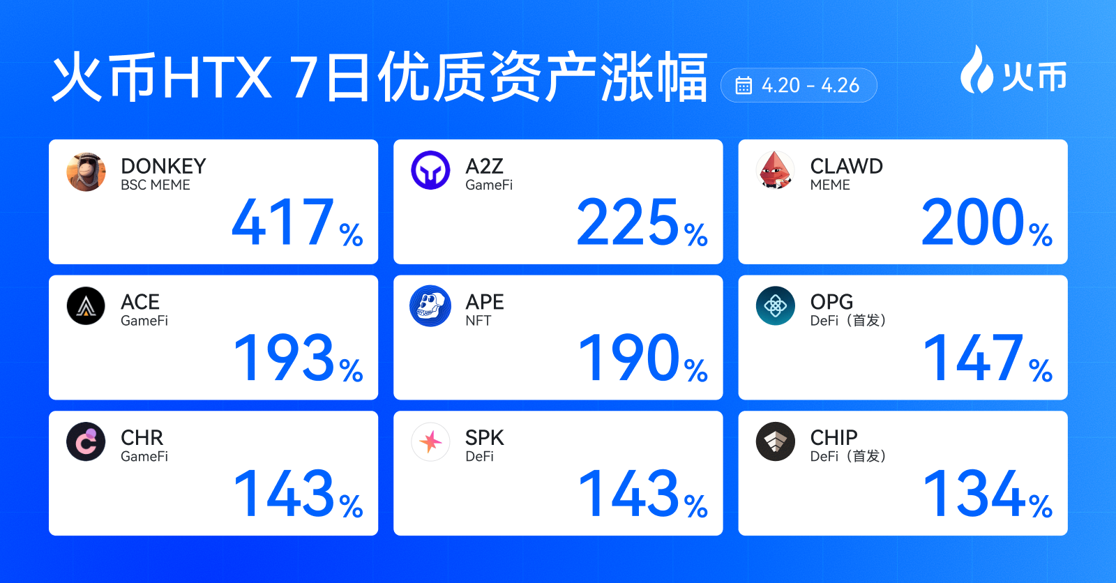 震荡中寻找确定性。加密市场在过去一周(4月20日—4月26日)依旧呈现典型结构性行情。主流资产波动趋于收敛的同时,链上资金明显向高弹性赛道迁移,带动DeFi、GameFi及Meme资产轮动上涨。据火币HTX 平台数据,周中DeFi赛道走强,CHIP(+134%)、SPK(+143%)、OPG(+147%)普涨;周末GameFi与NFT接力上行,A2Z(+225%)、ACE(+193%)、APE(+190%)表现突出,同时Meme资产DONKEY以+417%领涨全场。